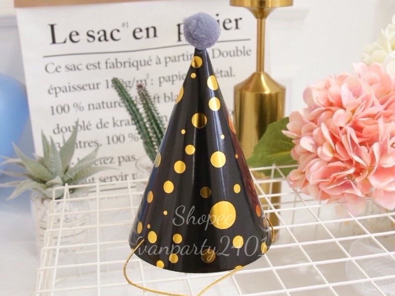 Nón sinh nhật ép kim chấm bi đen